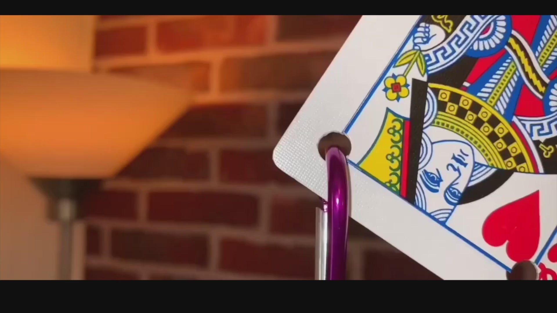 Nun nimm die Karte und stecke den Karabiner mit dem Schlüssel (dein eigener oder der eines Zuschauers) durch eines der beiden Löcher.